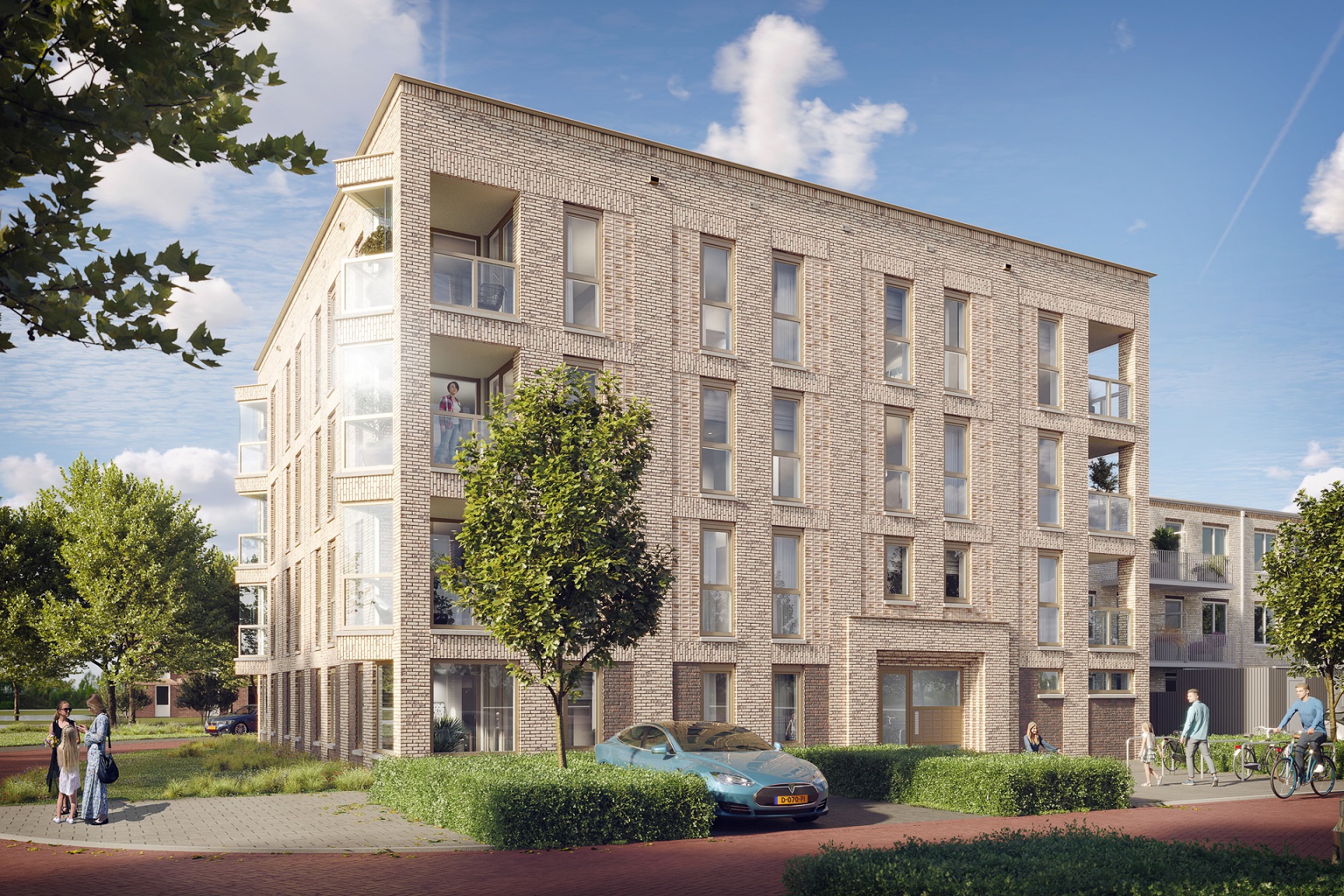 Voor Ibelings van Tilburg architecten hebben wij een eenvoudig robuust rechthoekig zandkleurig volume van vier bouwlagen hoog mogen uitwerken. De gevel van het appartementengebouw heeft een gevlochten patroon gekregen van verticale en horizontale metselwerk banen in combinatie met terugliggende vlakken met metselwerk op klamp. De begane grond heeft vlakken met een invulling van bruine steen gekregen, die het gebouw op deze manier een wat donkerdere plint geeft.